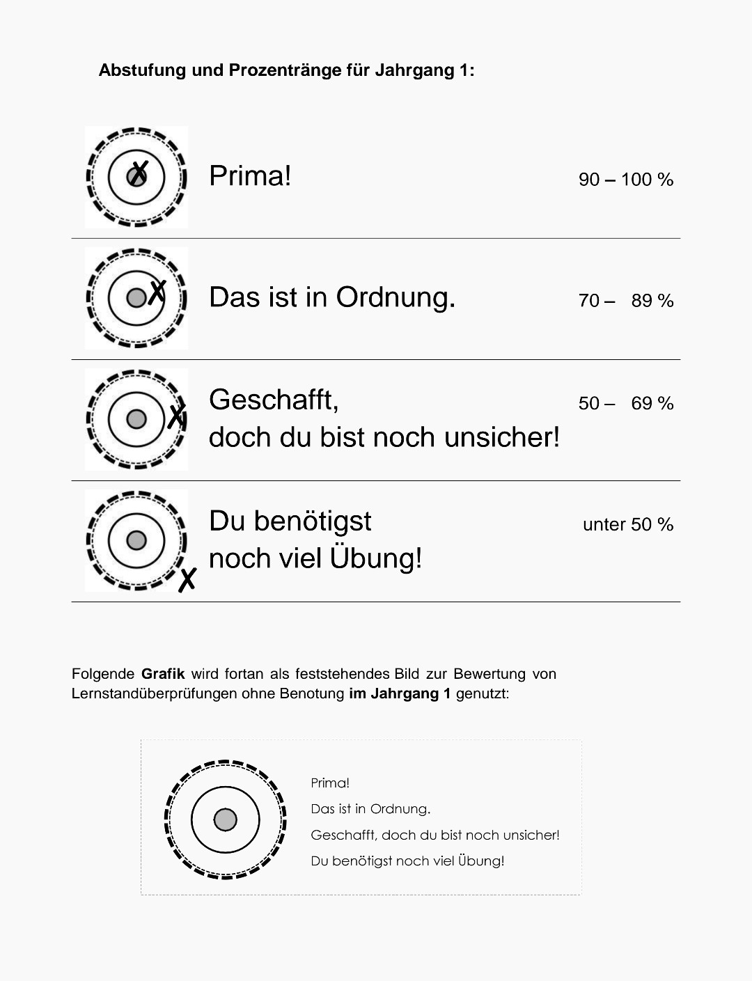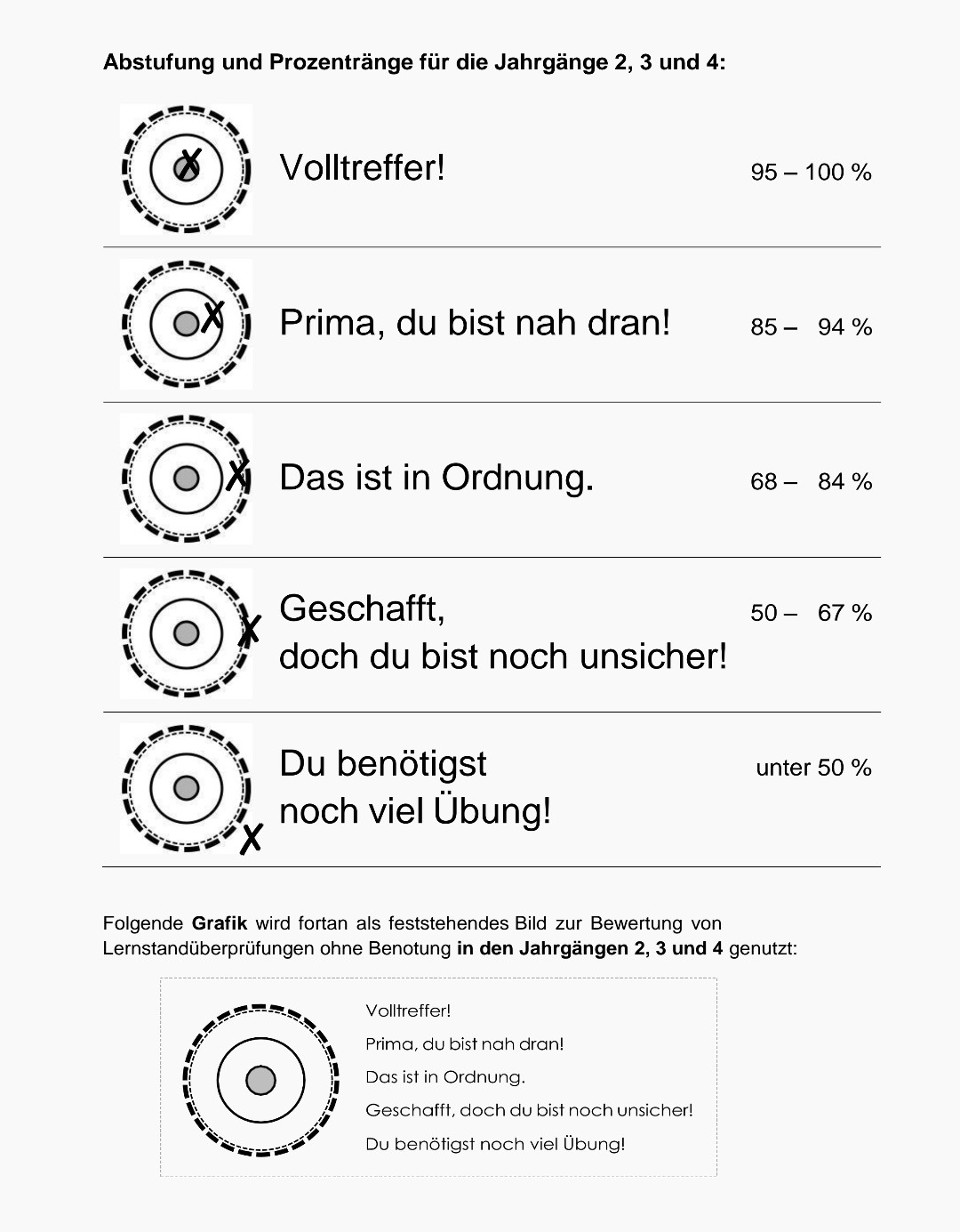 Zur Visualisierung des erreichten Leistungsniveaus bei Lernstandüberprüfungen ohne Noten wird in allen Jahrgängen die Zielscheibe mit entsprechenden Markierungen und Kommentaren eingesetzt – in den Jahrgängen 3/4 fünfstufig, in den Jahrgängen 1/2 vierstufig, da hier explizit eine direkte Übersetzung in Notenstufen vermieden werden soll.